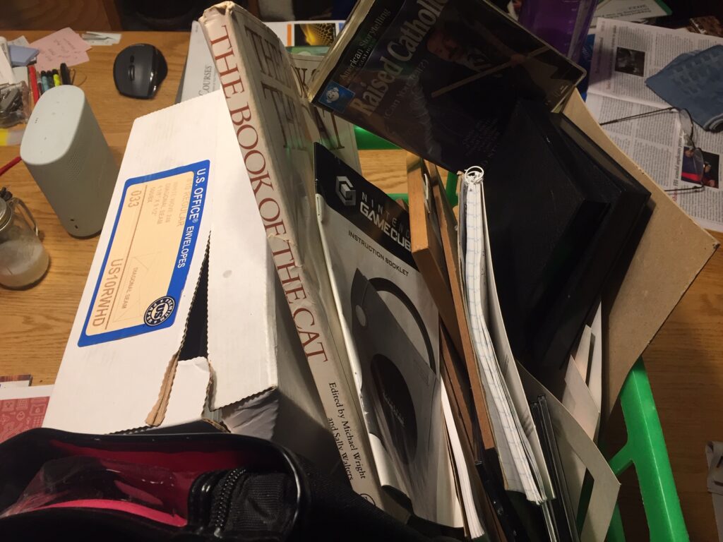CONTENTS: Instead of a box, this is a bright green plastic bin. Here’s a sampling of what’s in it: “The Book of the Cat,” a good reference book. What appears to be a carrying case for stickers, presumably belonging to one of the daughters. Two rolls of movie film — a family heirloom from somewhere? Instructions for a Nintendo Game Cube and a memory card. Empty frames. A heart-shaped rock that I probably picked up during a church service years ago. A framed picture of two cats, a tabby in a suit and a white cat in a dress, sitting on a couch together; they are, presumably, Mr. and Mrs. Cat. You will be shocked to learn that they don’t appear to be happy, and maybe “The Book of the Cat” can explain why.